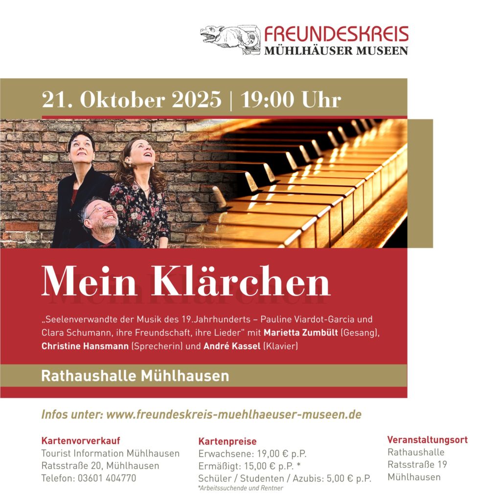 Der Liederabend "Mein Klärchen – Seelenverwandte der Musik des 19. Jahrhunderts: Pauline Viardot-Garcia und Clara Schumann, ihre Freundschaft, ihre Lieder" erlebt am Dienstag, 21. Oktober 2025, 19 Uhr, in der Mühlhäuser Rathaushalle seine Premiere. Marietta Zumbült (lyrische Sopranistin und lange Zeit Ensemblemitglied des DNT Weimar), präsentiert gemeinsam mit Christine Hansmann (Sprecherin und Autorin) und Andrè Kassel (Solorepetitor am DNT Weimar) diesen Liederabend um die Freundschaft zweier außergewöhnlicher Frauen.